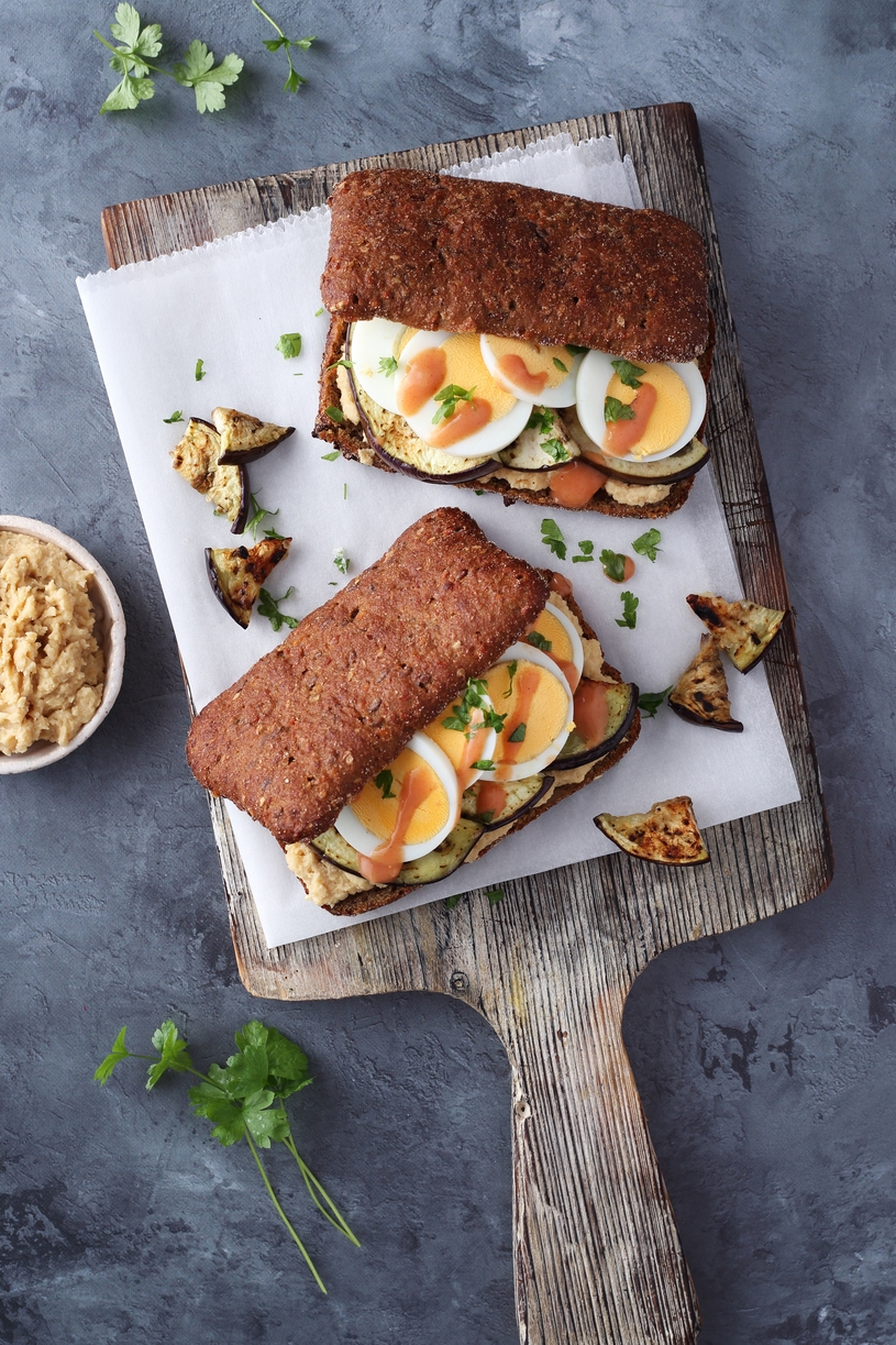 3.A kenyérszeletek belső oldalát forró, zsiradékmentes serpenyőben megpirítjuk. Összeállítjuk a szendvicset: az egyik kenyérszeletet megkenjük a csicseriborsókrémmel, majd megpakoljuk a sült padlizsánnal és a felkarikázott tojással. Teszünk rá egy kevés csípős mexikói szószt, megszórjuk aprított petrezselyemmel, végül rátesszük a tetejére másik kenyérszeletet is.