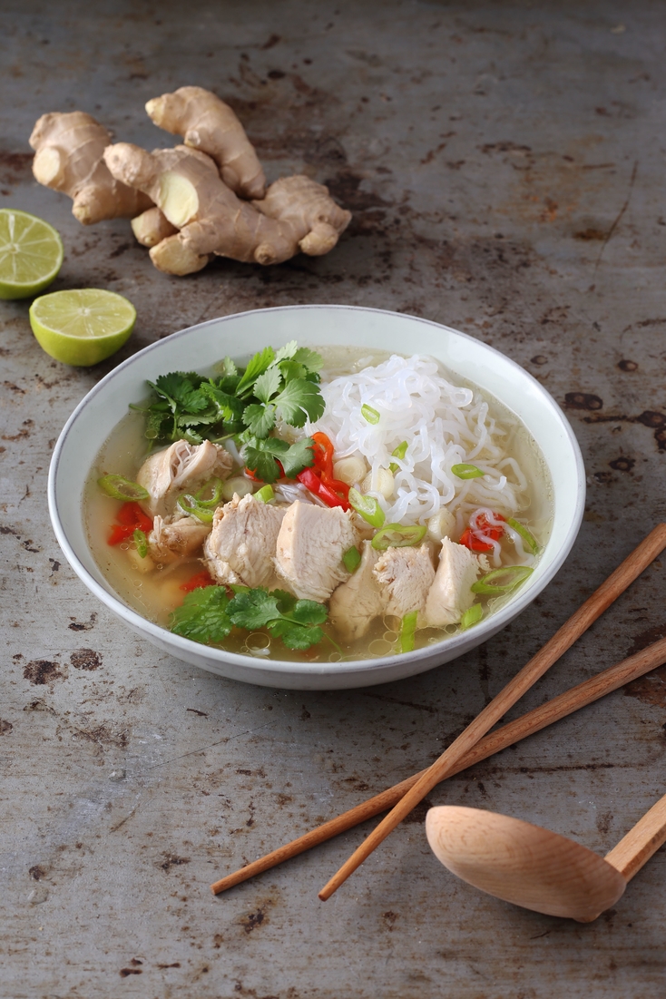 3.A kész levest a felszeletelt csirkemellel, korander- és újhagymazölddel, ízlés szerint további csilivel és kevés frissen facsart lime-lével tálaljuk.