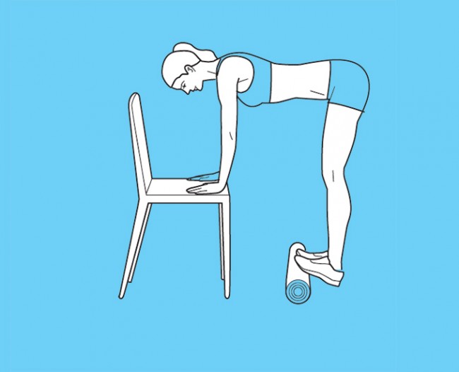 Állj szemben egy székkel, úgy hogy a lábfejed egy összetekert jóga matracon vagy törülközőn legyen. Csípőből hajolj előre, kézfejeddel pedig támaszkodj meg a széken. Ügyelj arra, hogy a karod pont a válladdal egy vonalban legyen. Sarkadat finoman nyomd a talaj irányába, és tartsd meg ezt a pozíciót egy percen keresztül. Összesen 3-5 ismétlést végezz.