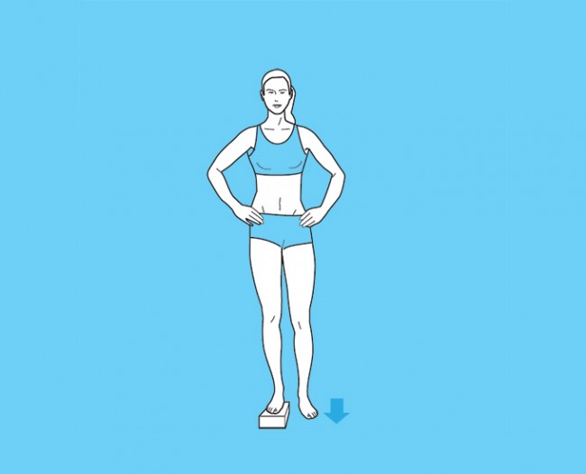 Állj mezítláb csípő szélességű terpeszben, jobb lábad alatt legyen egy vastagabb könyv, hogy magasabban legyen. Bal lábfejedet tartsd a talaj felett, kezek csípőre téve. Anélkül, hogy a térdeidet behajlítanád nyomd lefelé a jobb medencecsontod, ettől a bal csípőd megemelkedik. Tartsd meg ezt a pozíciót, majd ereszkedj vissza kiindulóhelyzetbe és emeled fel a bal lábfejed. Végezz összesen 10 ismétlést, majd jöhet a másik oldal!