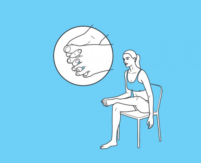 Kényelmesen helyezkedj el egy széken mezítláb, bal lábfejed tedd keresztbe a jobb térdeden, a bal térded pedig nézzen kifelé. Jobb kezdettel gyengéden válaszd szét bal lábujjaidat, és finoman masszírozd át őket, körülbelül egy percen keresztül, majd alaposan masszírozd meg a másik lábadat is.