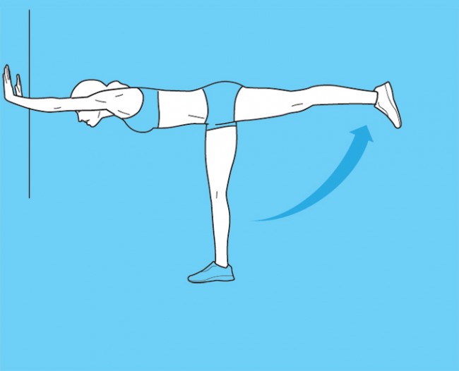Egy kiadós futás után kifejezetten ajánlott néhány hatásos erősítő gyakorlat beiktatása. A láblendítés remekül formálja és erősíti a farizmokat, amik magától a futástól nem fejlődnek. A kiindulóhelyzethez állj körülbelül 0,5 méternyi távolságra egy faltól, a térdeidet ne hajlítsd be, a lábak maradjanak végig egyenesek. Ezután csípőből dőlj előre, két tenyereddel támaszkodj neki a falnak vállmagasságban. Figyelj rá, hogy a csípőd végig előre nézzen és a hátad maradjon egyenes, ne domboríts! Emeld fel a kinyújtott bal lábad úgy, hogy a csípőddel egy vonalba kerüljön, majd tartsd meg ezt a pozíciót egy percig. Ezután végezd el jobb lábbal is a gyakorlatot. összesen 3-5 ismétlés legyen a cél mindkét oldalra!