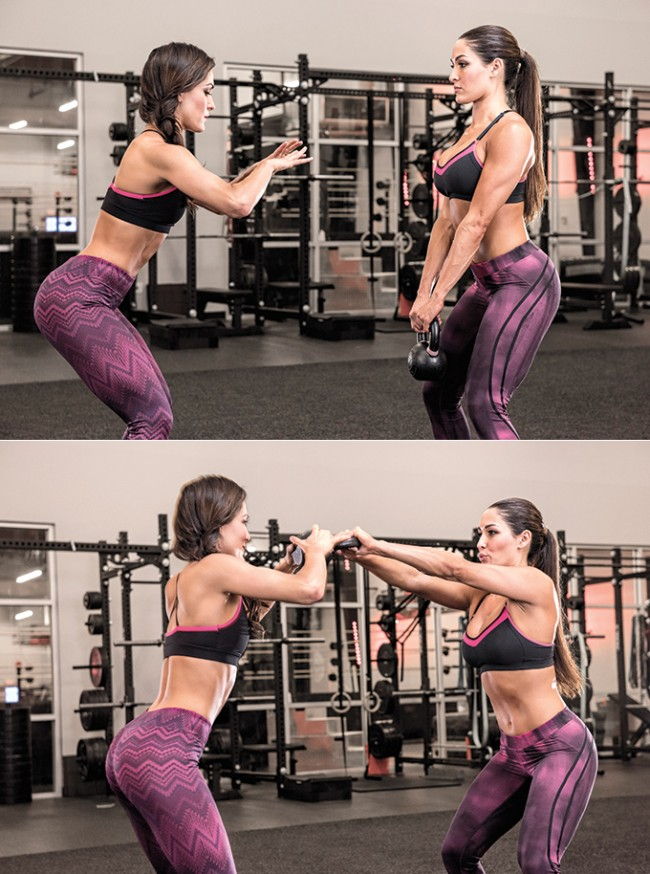 - A kettlebell-t tartó végezzen egy guggolásból lendítést az eszközzel, majd a másik állítsa meg az eszközt mellmagasságban, majd nyomja lefelé a következő lendítés előtt, ezzel is növelve az ellenállást. Mindketten végezzetek összesen két darab 20 lendítésből álló sorozatot.