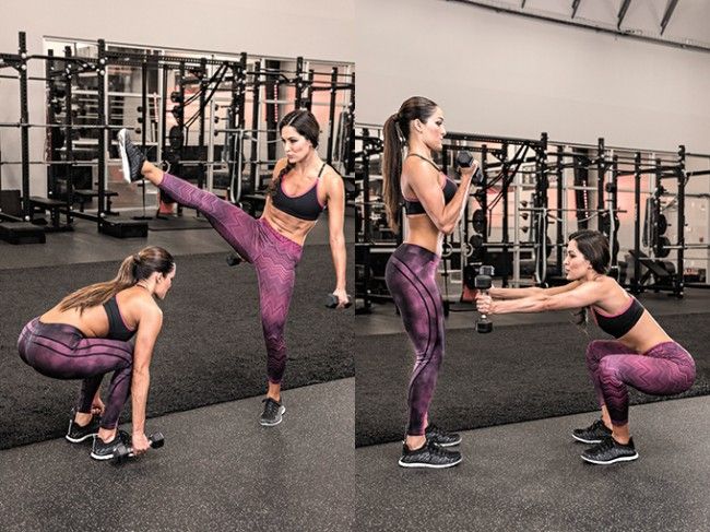- partner "A" végezzen egy jó mély guggolást, a súlyzókat engedje le majdnem egészen a talajig, miközben "B" partner végezzen egy lendületes kirúgást combkörzéssel a guggoló partnere feje fölött, a karját pedig tartsa közben nyújtva.